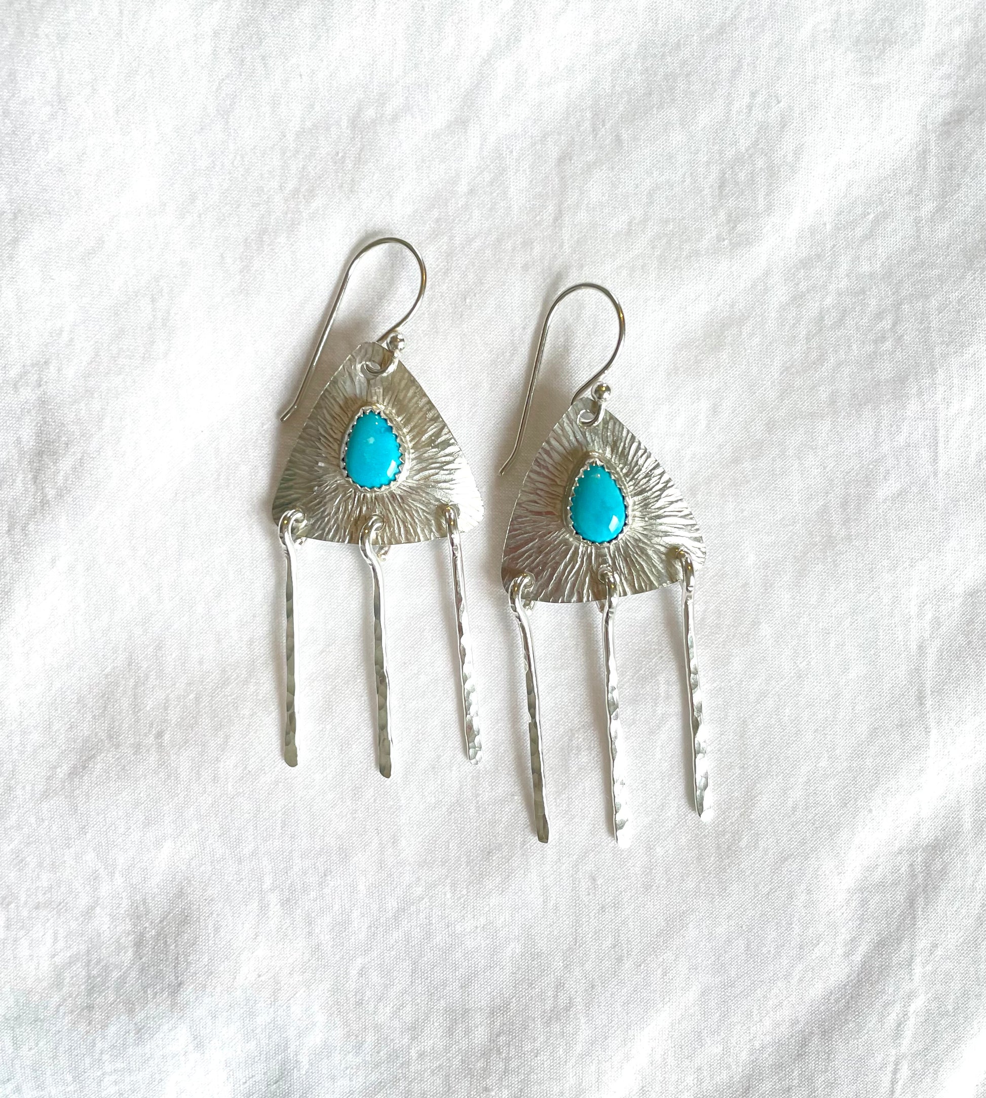 These mini fringe earrings feature two Kingsman turquoise tear drop stones and are 2.25 inches long.