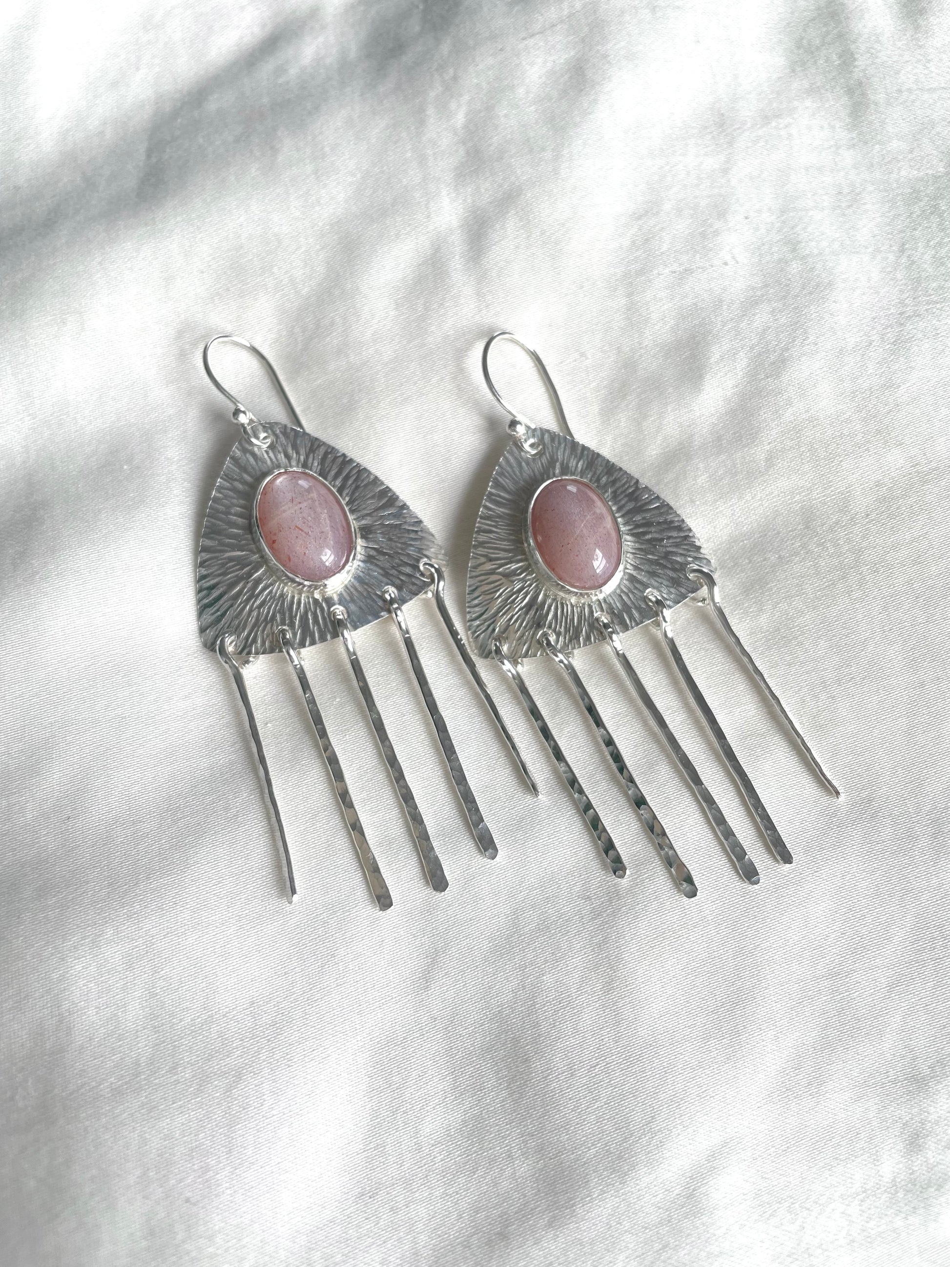 These fringe earrings feature peach Indian moonstones and are 2.75" long.